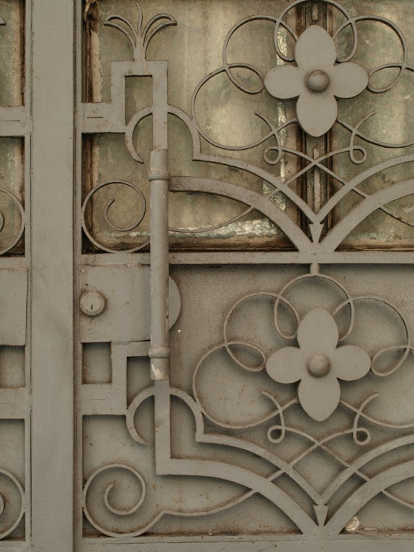 Yes, a sight like so many that I've photographed. Can't help myself with a falling-apart wall like that and the lovely, worn, chained up door. Love the sign and the fanned out squatty palm. And guess what? Look at the wires tamed and neatly enclosed, tacked up against the wall. There's something very resolute about it.